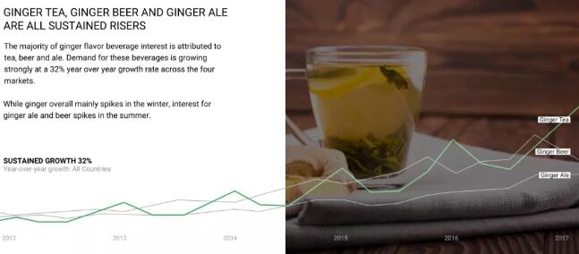 其实,谷歌发布的《2017年饮料趋势报告》中就指出,生姜饮料的年搜索量(包括美国、英国、西班牙、墨西哥4个地区)增长率为32%,包括姜茶、姜啤和生姜汽水,生姜水、姜汁等类别的搜索量增长率为79%。